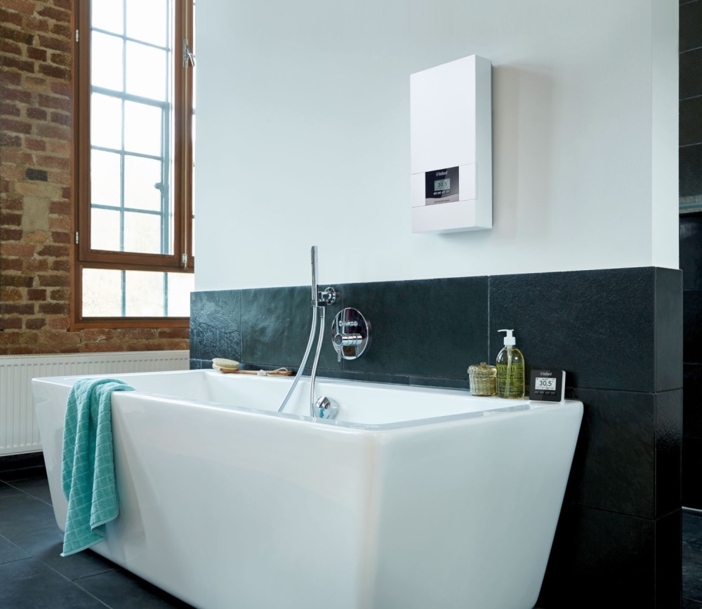 Der neue vollelektronische Vaillant Durchlauferhitzer electronicVED exclusiv im flachen, eleganten Design passt in jedes Bad und jede Küche, und die innovative Technik sorgt für bis zu 30 % Energie- und Wasserkostenersparnis. Das können Sie sogar beobachten: Der electronicVED exclusiv ist der weltweit erste Durchlauferhitzer mit integriertem EnergieMONITOR. Dank dieser einzigartigen Vaillant Innovation lassen sich Strom- und Wasserverbrauch in kW und cbm für die letzten 30 oder 360 Tage bzw. seit dem letzten Reset anzeigen, und zwar auf seinem großen, beleuchteten Grafikdisplay oder – noch bequemer – auf der wasserdichten bidirektionalen Fernbedienung. Beide haben dasselbe Klartext-Bedienmenü.