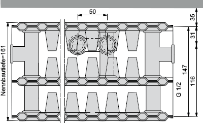- Mit 2 Anschlussmuffen unten mittig und 2 Anschlussmuffen seitlich G 1/2 IG.