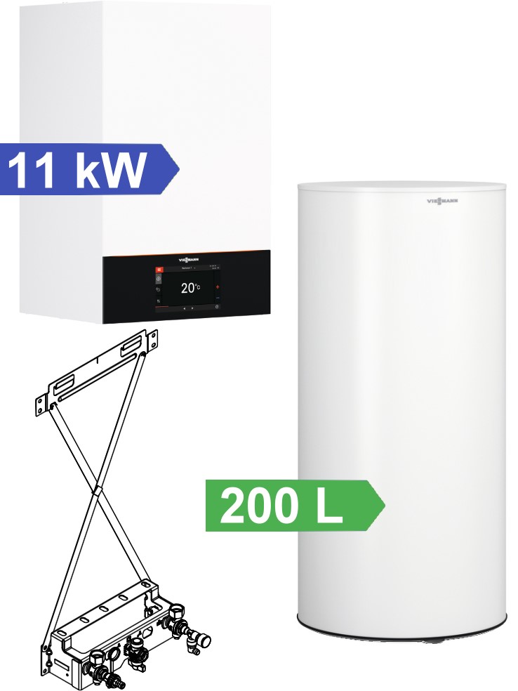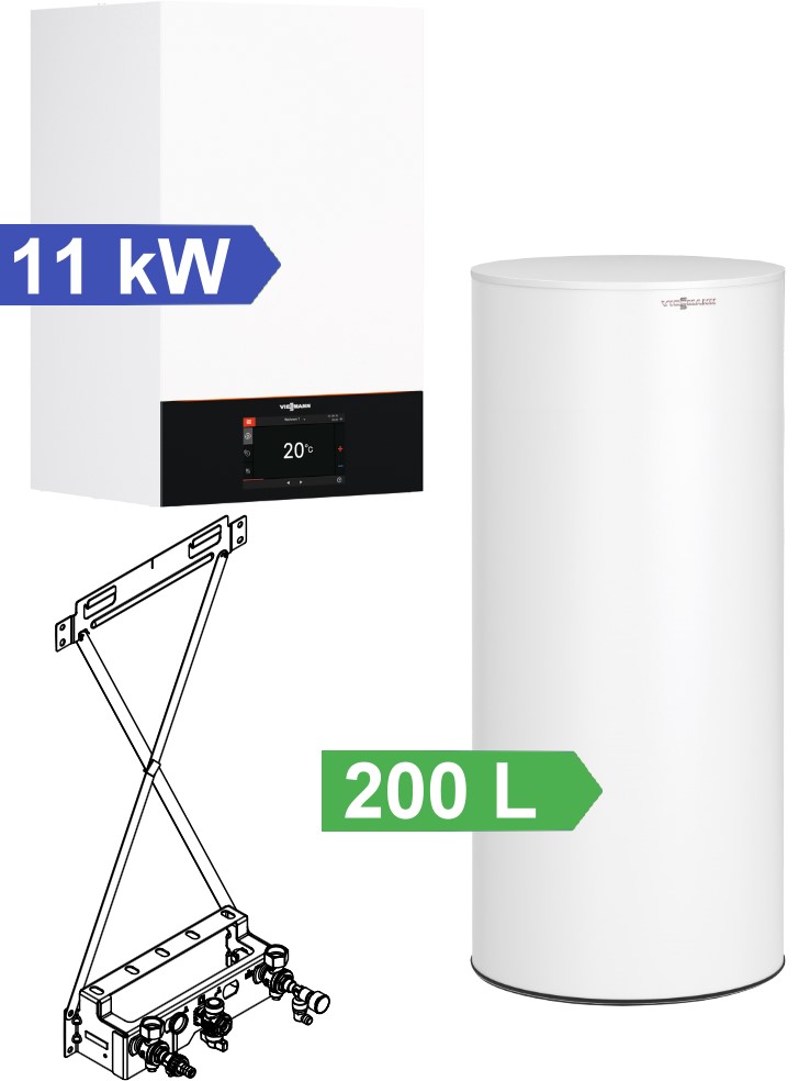 11 kW Gas-Brennwerttherme mit nebengestelltem hocheffizientem 200 Liter Speicher, Regelung, WLAN und Anschlusszubehör.