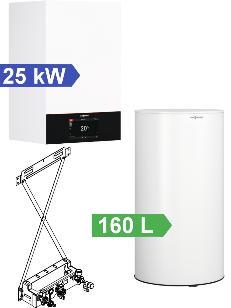 25 kW Gas-Brennwerttherme mit nebengestelltem hocheffizientem 160 Liter Speicher, Regelung, WLAN, ADG und Anschlusszubehör.