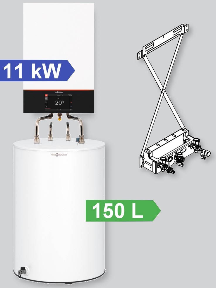 11 kW Gas-Brennwerttherme mit untergestelltem hocheffizientem 150 Liter Speicher, Regelung, WLAN und Anschlusszubehör.