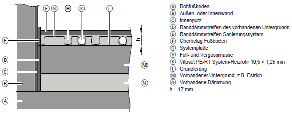 Beim Sanierungssystem werden Heizungsrohre in einer flachen Systemplatte fixiert, die in eine dünnschichtige, mineralisch gebundene Füll- und Vergussmasse eingebettet wird. Aufgrund der Materialeigenschaften kann die Schichtdicke hierbei wesentlich geringer sein, als die für Estriche in der DIN 18560 angegebene Mindest-Nenndicke. In Abgrenzung zum konventionellen Heizestrich nach DIN 18560-2 wird nachfolgend der Begriff „Füll- und Vergussmasse“ verwendet. Die Eignung verwendbarer Füll- und Vergussmassen muss für die Bedingungen vor Ort genau geprüft werden.