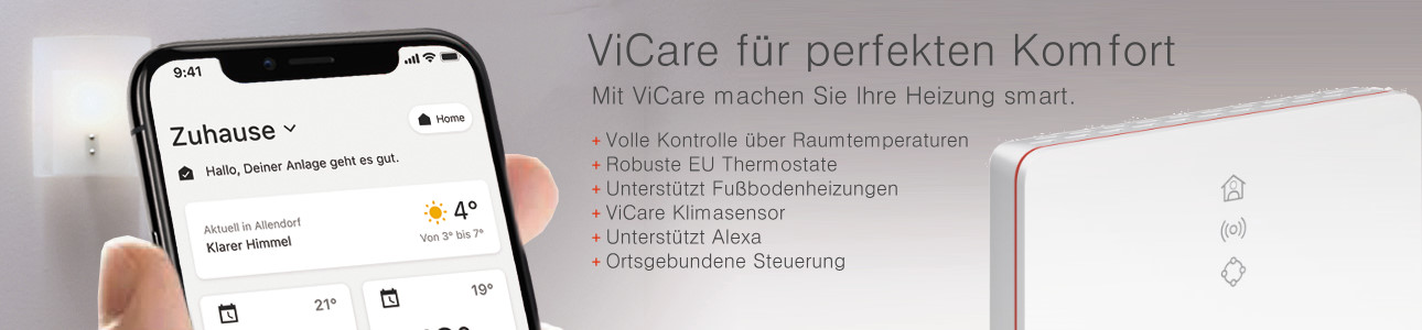 Heizkörperthermostaten. Diese sind mit der kostenlosen ViCare App über Smartphone oder Tablet steuerbar. Der Anwender kann so in jedem